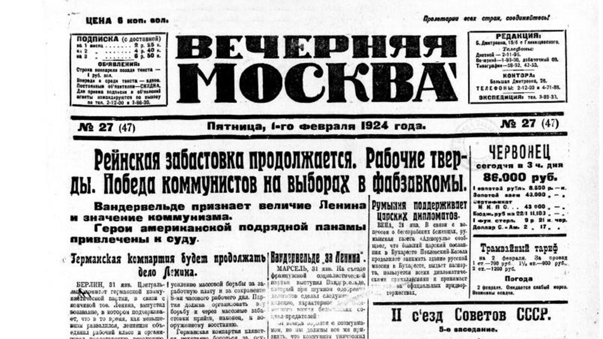 В газете «Вечерняя Москва» за 1924 год много разных историй про людей и бытовые подробности той эпохи. Например, показывают весь год «Историческую фильму» «Похороны Ильича» (я не ошибся «она моя» «фильма» – женского рода, как кинолента. А через 10 лет метро будет «он мой» –«московский метро») – объявление о том, что фильма кочует с экрана на экран идет весь год.