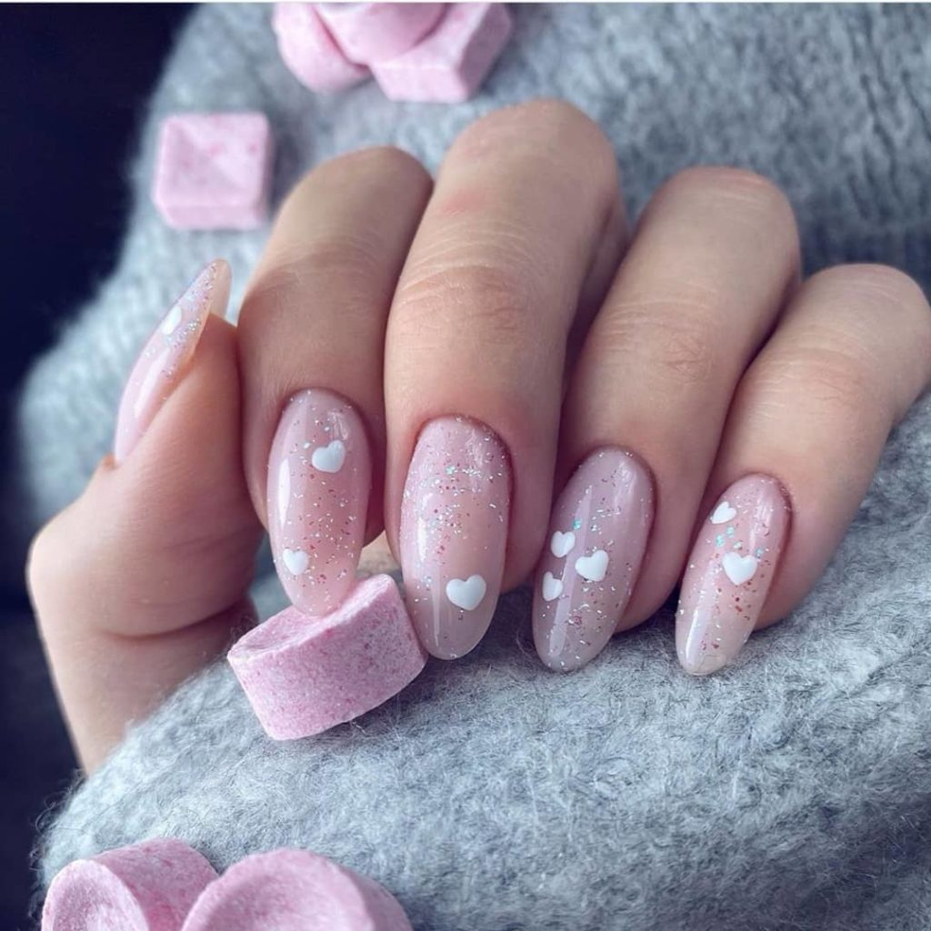 3. Россыпь глиттера. Блестки и глиттер добавят вашему маникюру блеска и шика. Выберите трендовые оттенки глиттера, например, серебряный, розовый или фиолетовый, и создайте нежное покрытие или акцент на одном ногте.