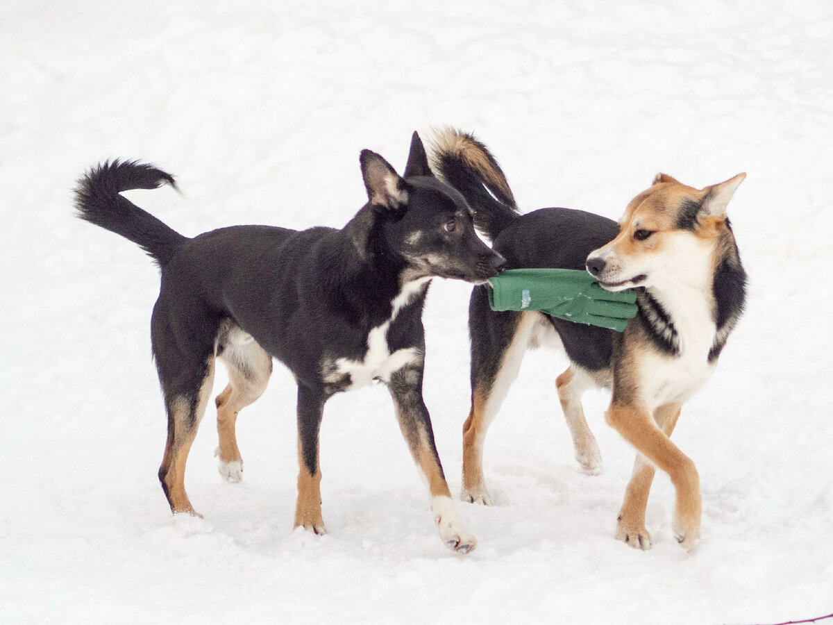 Несмотря "собственические" желания, догонялки перчатки, поиски ее в снегу и перетягивание ее, как каната, прошло мирно и победила дружба. Оба щенка остались довольны своей беготней!