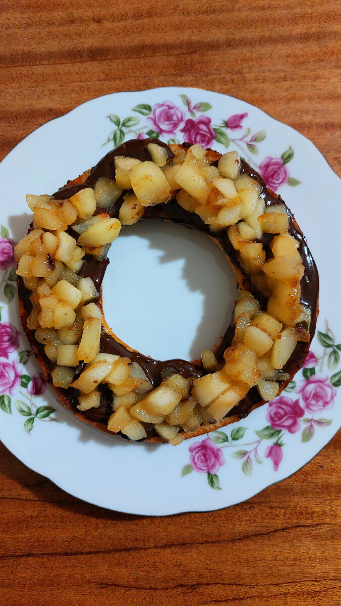 Сейчас расскажу, как приготовить вкусный десерт из обычных продуктов, вообще не напрягаясь. * Берём бублик и разрезаем его горизонтально, на две части. * Кисло - сладкое яблоко очистить от кожуры и нарезать мелким кубиком. * в сковороде распустить сливочное масло и обжарить яблоки, на небольшом огне, чтобы не горели. Добавить немного свежевыжатого апельсинового сока и чуточку коньяка ( впрочем, если этого нет под рукой, можно пропустить) * пока яблоки жарятся, займёмся бубликом. В сковороде распустить совсем немного сливочного масла, или обойтись вообще без него. И подсушить бублик со всех сторон. * На подсушенный бублик выкладываем дольки шоколада и закрываем крышку сковороды, буквально на две минуты, чтобы растопить шоколад. * в это время добавляем в яблоки мед, прогреваем и яблоки готовы. * растопленный шоколад распределяем по бублику вилкой и сразу выкладываем яблоки. Шоколад их зафиксирует. * бублик - 1 шт * яблоки - 1 шт * масло сливочное - 50 гр * мед - 1 чайная ложка
