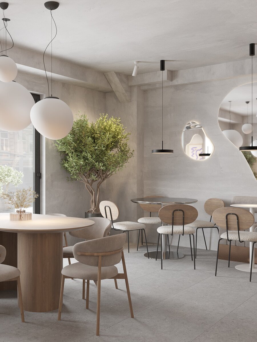 Волнообразные формы в интерьере создают атмосферу абстракции, которую подчеркивают необычные светильники и динамичное зеркало. Три произведения искусства на стенах превращают это место в настоящую галерею современного искусства. Достойным акцентом выступает стойка бариста в теплом древесном оттенке, гармонично вписывающаяся в общую картину.