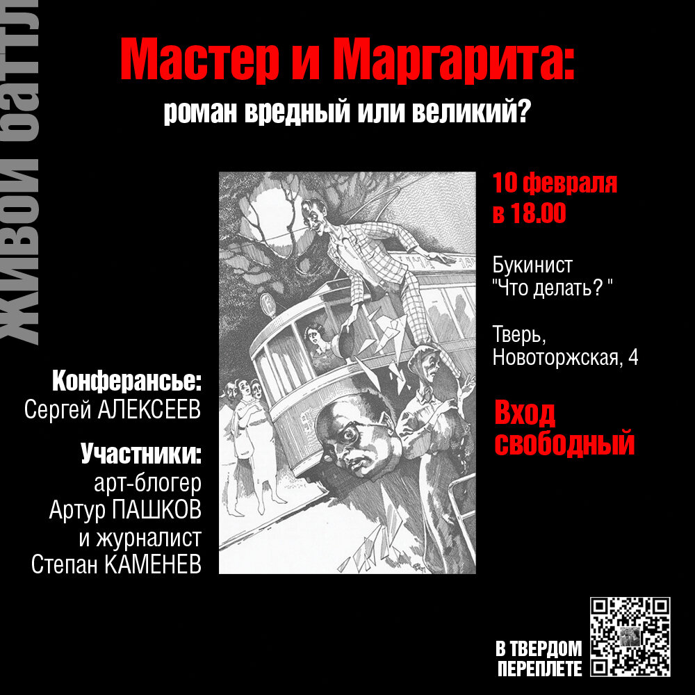 В связи с новой экранизацией «Мастера и Маргариты» заново вспыхнул интерес и к роману Булгакова, и к его интерпретациям в кинематографе. 10 февраля Тверское книжное сообщество «В твердом переплете» проведет живой баттл (в отличие от баталий, развернувшихся в интернете), на котором поставят вопрос ребром: «Мастер и Маргарита»: роман вредный или великий? На площадке букиниста "Что делать? " ведущий-конферансье Сергей Алексеев в присутствии заинтересованной публики, частью которой вы можете стать, столкнет мнения двух антагонистов – журналистов Артура Пашкова и Степана Каменева. С экспертным мнением выступит известный книжных обозреватель Владислав Толстов. В емких выступлениях участники рассмотрят темы творец и власть (посылал ли Булгаков сигналы Сталину?), вера и безверие, кто есть автор, что есть роман (антиевангелие?), конечно, экранизации и другие аспекты. Приглашаем всех любителей творчества Булгакова и ярых его ненавистников на баттл, где ваше слово тоже будет услышано, а ваш гол