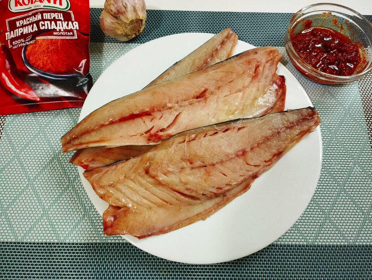 У каждой рыбины отрезать голову и плавники, удалить внутренности и разрезать на две части по хребту. Позвоночник и реберные кости удалить. С рыбой закончили, время заняться приправами.