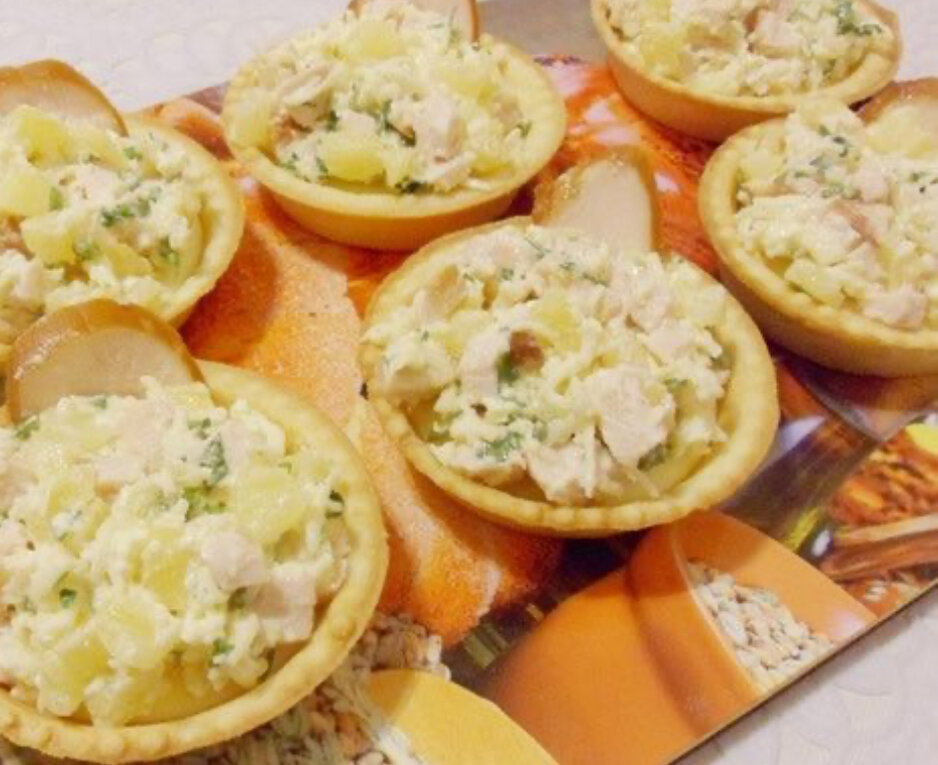 Салат с курицей и ананасами в тарталетках.