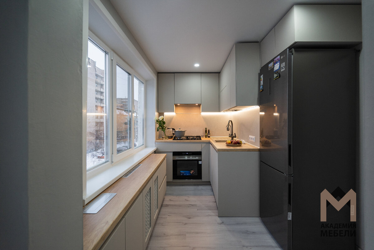 Установили светлую кухню на Самойло, 6. Самая большая проблема при планировании кухни – метраж помещения. Часто площадь не позволяет установить большой и просторный гарнитур, с обеденным столом, стульями и шкафами-витринами. Но даже в маленьком и узком пространстве можно воплотить кухню, которая отвечает всем вашим желаниям. Например, как в нашем новом проекте – кухне на Самойло, 6. Ее размер: 1750/1620 мм. Для ее изготовления использовали пастельную светлую цветовую гамму. Сочетание корпуса ЛДСП Ламарти в оттенке "Серый" и фасадов МДФ в оттенке "Керамика" смотрится естественно и гармонично. Легкие и светлые цвета наполняют кухню светом и придают легкости. Столешница в декоре "Дуб Небраска натуральный" прекрасно дополняет эту комбинацию привнося нотку уюта. Для такого небольшого помещения мы использовали П-образную планировку. Таким образом, расширили 2 зоны: хранения и рабочую. У подоконника расположен узкий модуль с выдвижными ящиками, и полками. Он эстетично скрыл радиатор отоплени