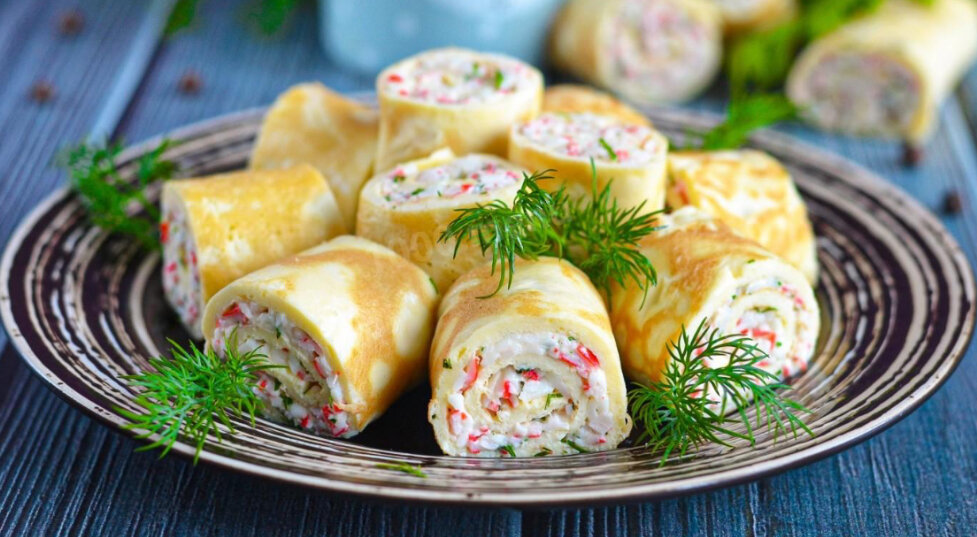 Рулетики из яичных блинчиков с начинкой.