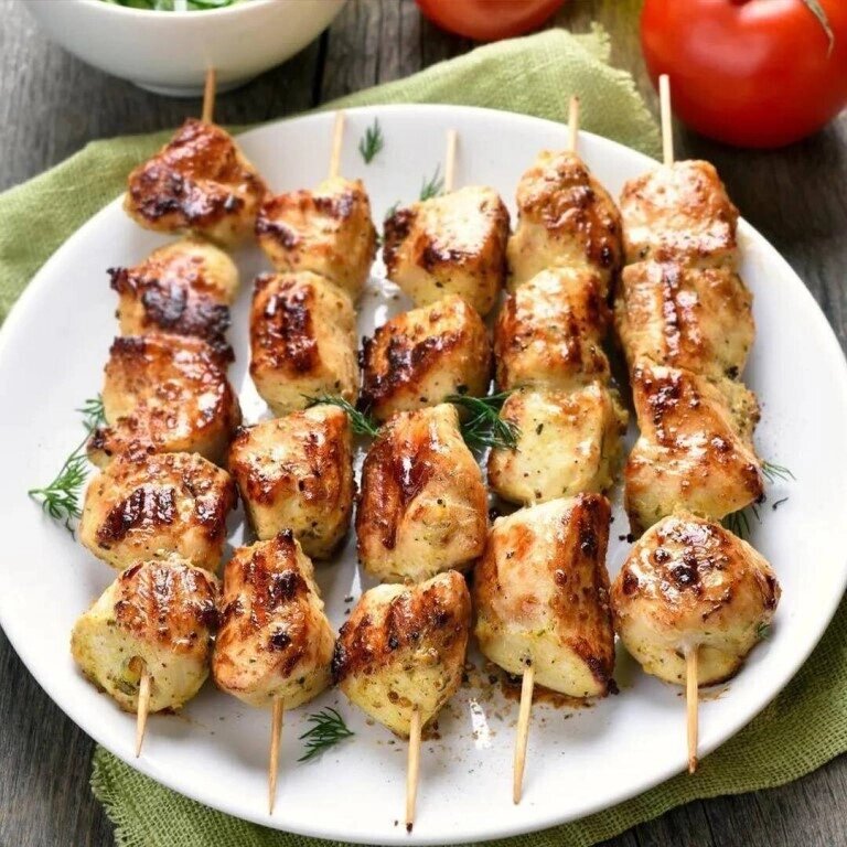 Ингредиенты: - Куриное филе - 600 г. - Соевый соус- 40 мл. - Растительное масло- 40 мл. - Мёд - 1 ст. л. - Лимон - 0,5 шт. - Чеснок - 3 зубчика - Приправа для курицы - 1 ст. л. ГОТОВИМ: 1. Куриную грудку следует тщательно вымыть и нарезать крупными кубиками. 2. Для маринада в миске смешать соевый соус, мед, мелко порубленный чеснок, специи и сок половинки лимона. 3. Замариновать куриное филе в маринаде и оставить в холодильнике на 6-12ч. 4. Замочить шпажки на 30 минут в холодной воде. 5. Замаринованное филе насадить на шпажки. Шпажки следует установить на любой подходящей форме для запекания так, чтобы мясо оставалось на весу. 6. Отправить куриные шашлычки в духовку и запекать при 200 градусах 30 минут. Периодически доставайте форму и переворачивайте шпажки, чтобы шашлычки успели зарумяниться со всех сторон. Приятного вам аппетита!