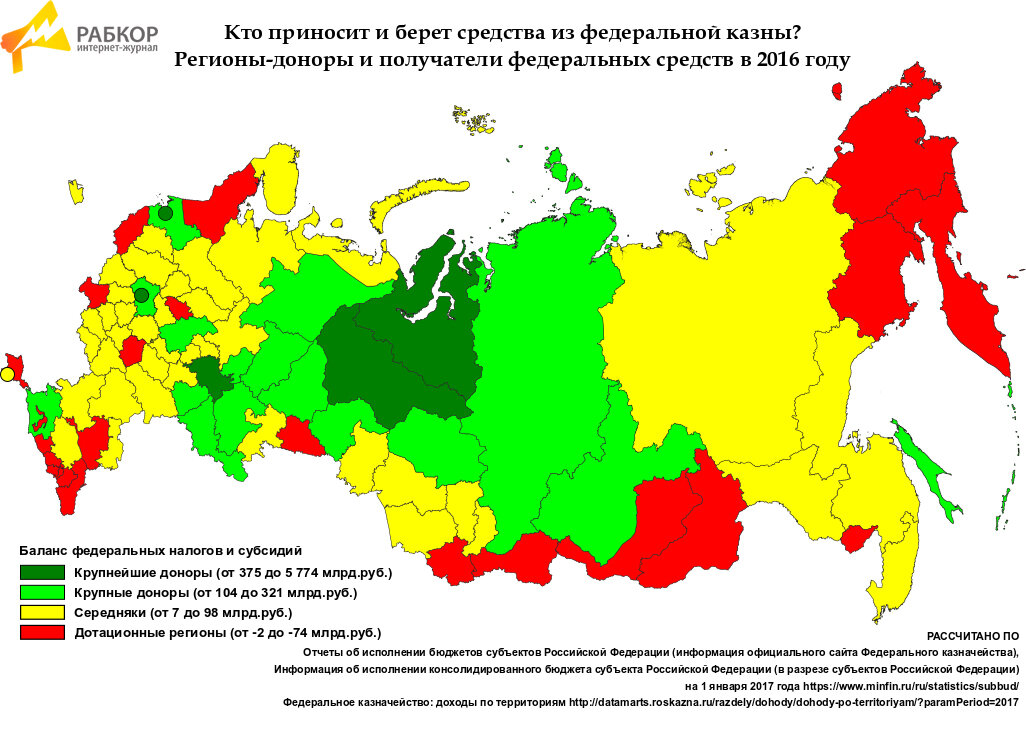 Давайте напомню простые факты, количество регионов-работодателей немного даже превышает количество регионов-доноров, тут чуть ниже карта доноров и реципиентов, где доноры зелёные , а реципиенты - красные, но вот в жёлтых регионах, одним из которых является крупнейший по территории субъект РФ - Якутия это тоже регион-работодатель . Кстати как Новгородская область и ещё десяток-другой западных регионов оказались жёлтыми я в упор не понимаю, они должны быть по идее красными .