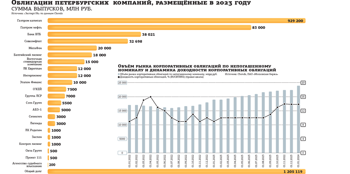 Эмитенты с петербургской пропиской также значительно увеличили объём размещений по сравнению с 2022 годом. Как подсчитал "Эксперт РА", в общей сложности компании из Петербурга разместили облигаций на 1,2 трлн рублей (без учёта замещающих облигаций).