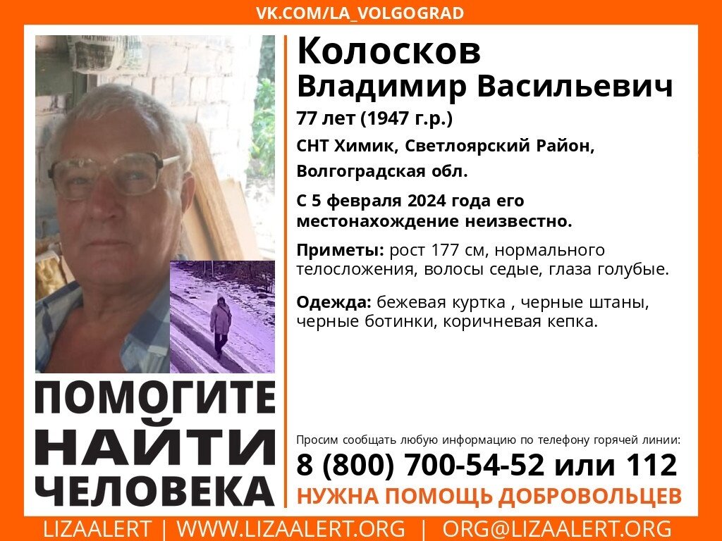В Волгоградской области ищут 77-летнего Владимира Колоскова. Об этом сообщает поисковый отряд «Лиза Алерт». Пожилой мужчина исчез в СНТ «Химик» в Светлоярском районе в понедельник, 5 февраля. Он ущел в длинной бежевой куртке, черных штанах, ботинках и в коричневой кепке. По пути пенсионер попал на камеры видеонаблюдения. Где именно, не сообщается. У него седые волосы и голубые глаза. Для поисков Владимира Колоскова собирают добровольцев. Любую информацию о нем можно сообщить в правоохранительные органы. Ранее мы писали, что в городе Котово еще 31 июля 2023 года 67-летний Александр Нааб ушел из квартиры № 28 дома № 33, расположенного на улице Победы. После этого уроженец деревни Стрункинской Называевского района Омской области пропал без вести. В настоящее время его разыскивают местные полицейские. Анна Анатольева