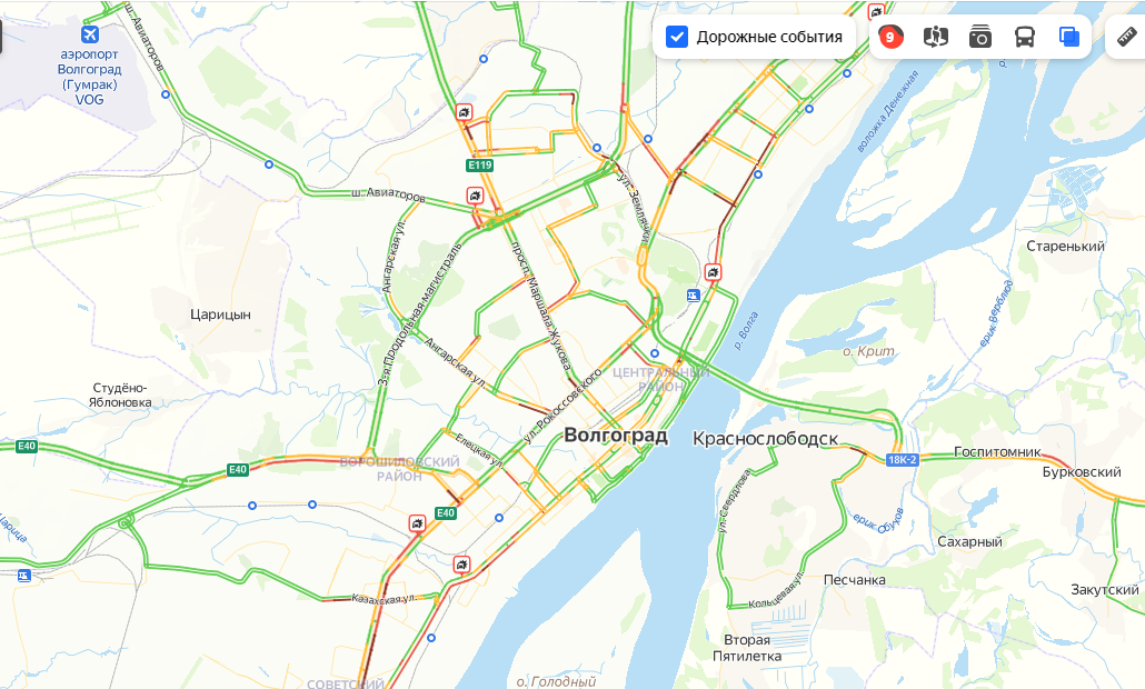 Волгоград из-за выпавшего с вечера 5 февраля снега застыл в гигантских пробках. Не секрет, что любые осадки превращаются для города-героя в стихийное бедствие. И этот снегопад не стал исключением. Утром во вторник спешащим на работу и по делам волгоградцам пришлось запастись терпением и пройти испытание пробками. Яндекс.Пробки Их интенсивность к девяти часам достигла 9 баллов из 10. Самые крупные заторы образовались в районе Красного Октября и на улице Маршала Еременко. В северной части города «застыла» улица Шурухина. Продолжает расти затор на Университетском проспекте и улице Рабоче-Крестьянской, где произошел сбой из-за «заклинившего» светофора. По словам очевидцев, на место направили сотрудников ГАИ, которые будут следить за дорожным движением. Также, несмотря на запрет, по дорогам Волгограда продолжают ехать фуры, создавая еще большие сложности в движении. С 1 февраля на территории города было официально введено ограничение движения для грузового транзитного транспорта. А вот южна