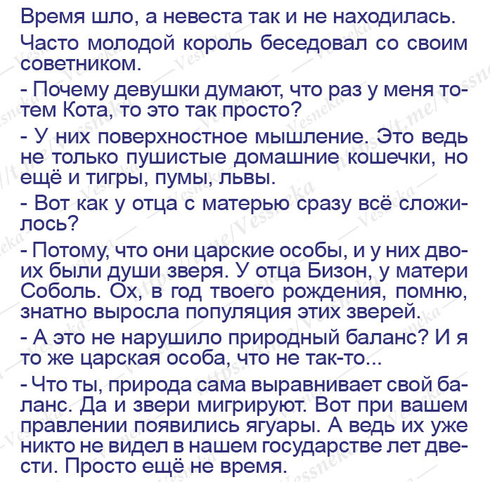 Сказочный привет всем! Давным-давно на заре времён, когда ещё не было человечества, в некотором царстве Колдунском государстве жил был молодой король Белояр. Ох и завидным он был женихом. Какие только принцессы не хотели его заполучить в мужья. Да только не одна из них не могла пройти испытание. Нужно чтобы избранница приняла душу зверя короля, как и та её. А вот с этим и была загвоздка. Не было таких. Тут и сказочки конец, а кто дочитал, того люблю. А кто себя узнал, того обнимаю. Прототип сказки: Спасибо что со мной! © 21 июня 2024 г. Vesneka Мила, фото автора Запрещается без разрешения автора цитирование, копирование как всего текста, так и какого-либо фрагмента данной сказки. Является интеллектуальной собственностью автора. Все персонажи вымышленные, совпадения случайны. ПОДПИСКА НА МОЙ КАНАЛ Мой Ютуб: https://www.youtube.com/@Vesneka/videos Спасибо всем, кто мне помогает.