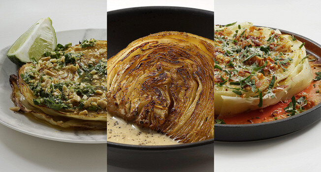 ТРИ РЕЦЕПТА — ТРИ СПОСОБА ПРЕВРАТИТЬ БАЗОВЫЙ ОВОЩ В ГЛАВНОЕ БЛЮДО НА СТОЛЕ Даже самый простой, недорогой и привычный нам продукт может заиграть новыми красками, ведь зачастую главный ингредиент блюда — это фантазия. Мы решили пофантазировать на тему белокочанной капусты — с ней обычно делают салаты и супы. А что, если запечь ее в духовке и снабдить яркими соусами? Так обычная капуста превратилась в основательное, но легкое и полезное основное блюдо, идеальное для тех, кто ищет новые вкусы. Три рецепта капусты в духовке — с беконом и пармезаном, в сливочно-перечном соусе (это идеологическая замена стейкам с перечным соусом) и пряная, в азиатском стиле. На любой вкус и на любое настроение, а главное, такое бюджетное блюдо на столе — это взрыв новых органолептических ощущений и сытный обед без мыслей о калориях. Готовьте с нами и оставляйте свои комментарии под этим материалом: как вам идея запечь белокочанную капусту в духовке и подать ее с яркими соусами? Капуста в духовке с беконом и п