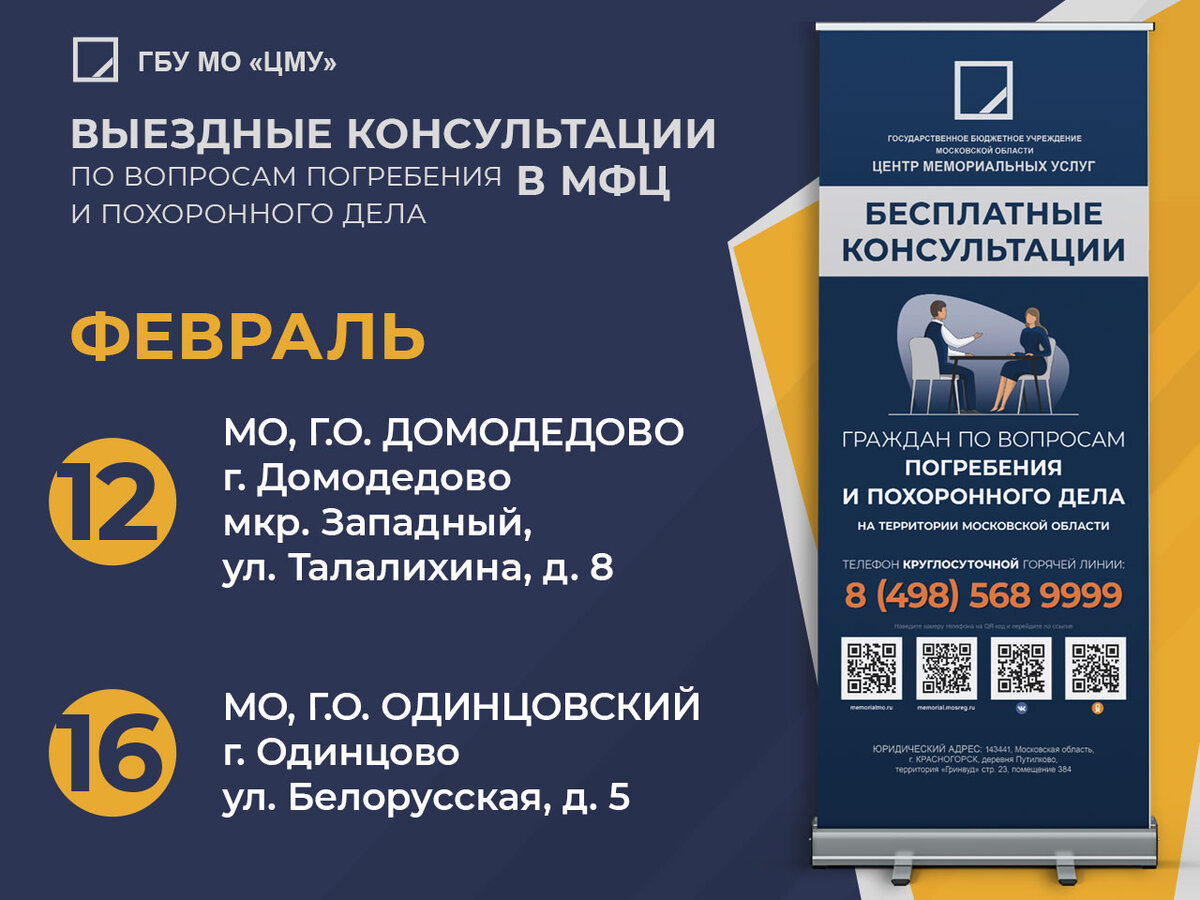 Напоминаем о возможности получить бесплатную консультацию в МФЦ вашего города. Если у вас есть вопросы по законодательству сферы погребения и похоронного дела - приходите в ближайший МФЦ на консультацию к нашим специалистам. 🔻Сегодня консультанты ГБУ МО "ЦМУ" будут ждать вас в МФЦ, расположенном по адресу: г.о. Домодедово, г. Домодедово, мкр. Западный, ул. Талалихина, д. 8 🔻16 февраля - г.о. Одинцовский, г. Одинцово, ул. Белорусская, д. 5 Также получить бесплатную консультацию в сфере погребения и похоронного дела можно удаленно, обратившись на круглосуточную горячую линию ГБУ МО "ЦМУ" по номеру телефона 8 (498) 568-99-99. #гбумоцму #московскаяобласть #подмосковье #консультирование #моидокументы #одноокно #мфцподмосковья #консультациявмфц #мфцдомодедово #мфцодинцово