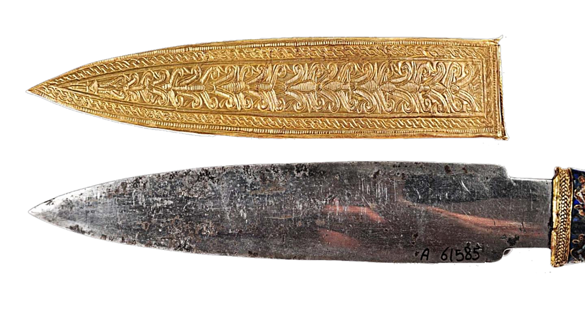В состав данного кинжала в основном входит железо (Fe), 11% никеля (Ni) и 0,6% кобальта (Co). Содержание никеля в основной массе металла большинства железных метеоритов колеблется от 5% до 35%, а в исторических железных артефактах из земных руд, оно менее 4%. Точно - метеоритное железо!