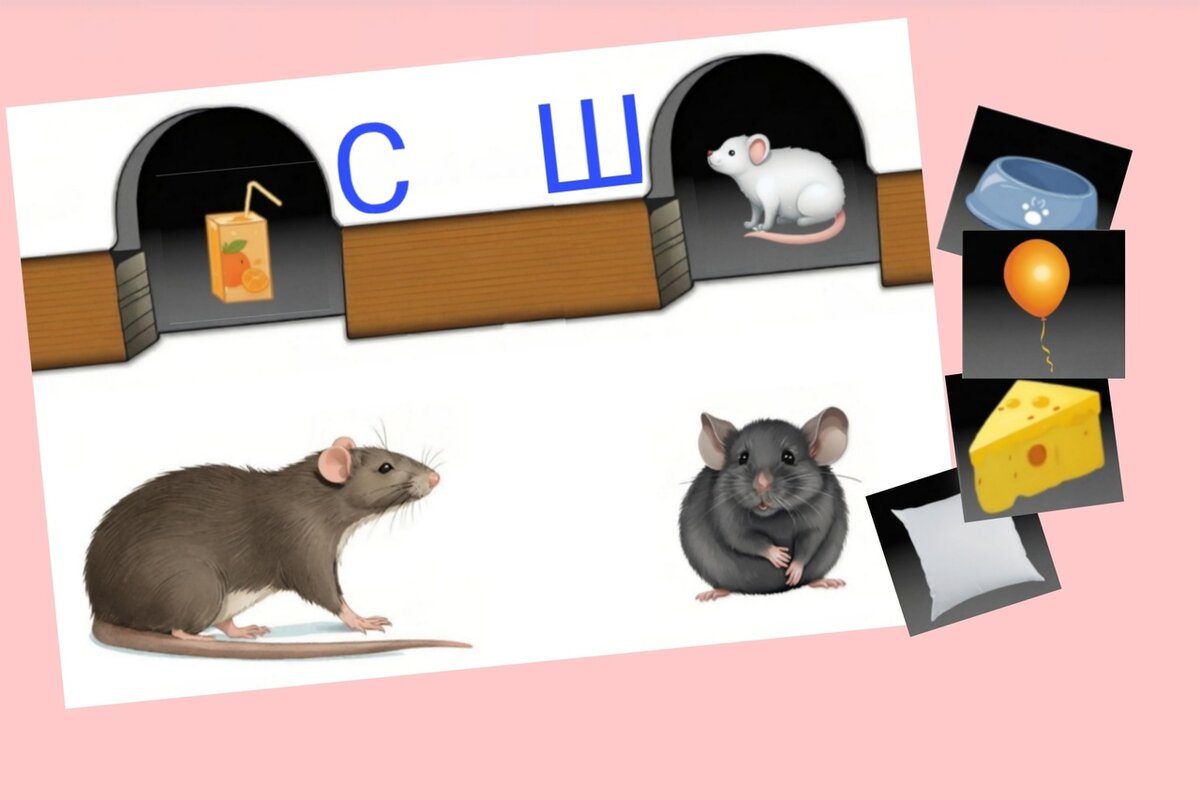 Для дифференциации звуков [С] и [Ш], можно предложить ребенку назвать что спрятано в норке у крысы (слова со звуком [С]), а что у мышки (слова со звуком [Ш]).