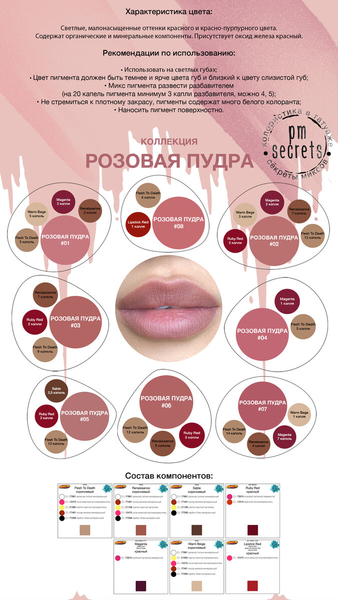 Характеристика цвета: Светлые, малонасыщенные оттенки красного и красно-пурпурного цвета. Содержат органические и минеральные компоненты. Присутствует оксид железа красный. Рекомендации по использованию: • Использовать на светлых губах; • Цвет пигмента должен быть темнее и ярче цвета губ и близкий к цвету слизистой губ; • Микс пигмента развести разбавителем (на 20 капель пигмента минимум 3 капли разбавителя, можно 4, 5); • Не стремиться к плотному закрасу, пигменты содержат много белого колоранта; • Наносить пигмент поверхностно.