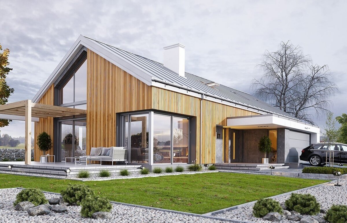 Данный проект -это одноэтажное здание с мансардой, построенного в виде прямоугольника с выступающей передней частью, где располагается гараж. Дом покрыт двускатной крышей. Площадь составляет 127 м2. Дизайн дома выдержан в современном стиле дома-амбара. Крыша здания не имеет карнизов, кровля спроектирована из листового металла ,а наружные стены отделаны вертикальной облицовкой из дерева. Все это подчеркнуто двускатной крышей с углом наклона 35 градусов. Такое сочетание материалов с поверхностями из плит, имитирующих бетон, и серыми оконными блоками обеспечивает очень привлекательный внешний вид. Интерьер