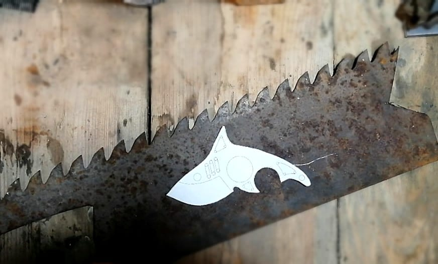 Здравствуйте уважаемые подписчики канала нож и ножны и все те, кто зашёл ко мне из любопытства. Захотелось сделать что-то нестандартное, необычное. Нашел подходящий эскиз и занялся изготовлением трафарета. Решил использовать уже закаленный метал, выбор пал на полотно рамной пилы 9ХФ. Данное полотно является уже готовым материалом для клинка, так как уже с завода идет закаленным. После подготовительных работ приступил к делу. На первом этапе вырезал заготовку из пилы. Болгарка справилась на ура, да и я тоже молодец. Но вот пришло время делать дырки (технические отверстия) под палец, темляк, ну и глаз для понту. Тут-то я и встрял. Так как металл был уже каленый, сверлить его оказалось не просто, благо был я к этому готов. В закромах у меня нашлось пару кобальтовых сверл разных диаметров. Спустя пару часов задача была выполнена, дрель стойко перенесла это испытание. Затем я обработал края на точильном камне и приступил к формированию лезвия и спусков. Важно в процессе всей обработки не до