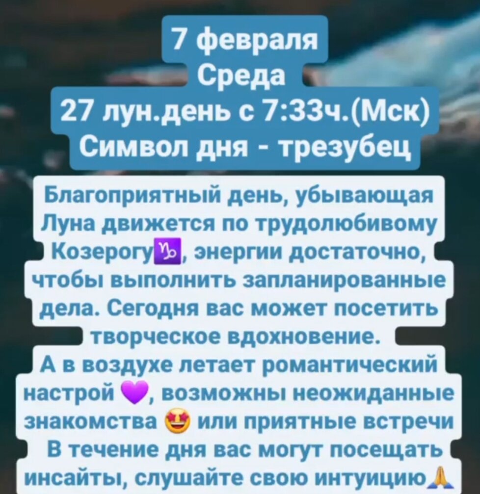 Благоприятный день, убывающая Луна движется по трудолюбивому Козерогу♑️, энергии достаточно, чтобы выполнить запланированные дела. Сегодня вас может посетить творческое вдохновение. А в воздухе летает романтический настрой 💜, возможны неожиданные знакомства 🤩 или приятные встречи В течение дня вас могут посещать инсайты, слушайте свою интуицию🙏 На вечер обязательно наметьте что нибудь такое, что доставляет вам удовольствие🌟 27 лун.день связан с медитацией, презрением, получением знаний. #гороскоп #астрология #луна #астрологияонлайн #астропрогноз #овен #телец #близнецы #рак #лев #дева #весы #скорпион #стрелец #козерог #водолей #рыбы