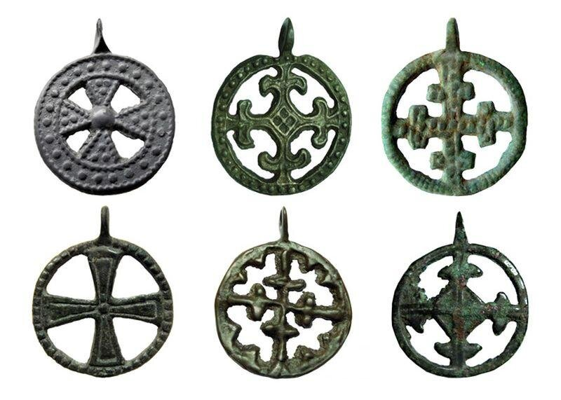 История этого артефакта уходит в глубину веков и никакого отношения к христианству не имеет. На раскопках крестов домонгольского периода никакого распятия вы не увидите от слова совсем, а в тоже время в византийских находках сплошь и рядом. Кто то, как например Яков Перельман, знаменитый популяризатор науки конца 19 и начала 20 века, говорил об этом так. Кстати именно эти страницы были изьяты из его Занимательной механики в более поздних изданиях. Я не соглашусь с мнением уважаемого мною человека исключительно потому, что знаю какие артефакты копировали эти привески. Причем их было 2 разных вида - включенные в окружность и нет. Тем не менее, религиозная ложь использовала даже этот карго культ в своих целях Нашлепка на груди у Махавиры (джайнизм), которую я уже показывал в этой статье, имеет как раз детализированную форму одного из артефактов. И хотя я осуждаю черных копателей, но тогда и официоз должен ответить сполна, за свою наглую и беспринципную ложь.