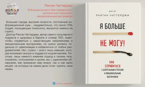 - Книга "Я больше не могу! Как справиться с длительным стрессом и эмоциональным выгоранием" автора Рангана Чаттерджи - это очень полезное руководство для всех, кто страдает от стресса и выгорания. Автор ясно и просто объясняет, как стресс влияет на наше тело и разум, и предлагает практические инструменты для его справления.