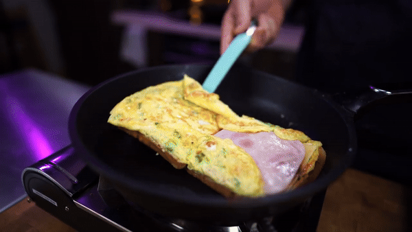 На 2 бутера ▪Хлеб тостовый - 4 штуки ▪Яйца - 4 штуки ▪Ветчина ▪Сыр ▪Сладенький джемчик или варенье ▪Лук зеленый ▪Соль ▪Перец ▪Сливочное масло Яичная смесь. Взбиваем яйца, соль, перец и резанный зеленый лук На скоровдку сливочное масло и выливаем половник яичной смеси в виде блинчика Выкладываем тостовый хлеб, 2 куска, предварительно обмакнув одну сторону в еще не готовом блинчике Обжариваем так минутку Переворачиваем и выкладываем любую начинку на один кусок хлеба. У меня это ветчина, сыр, джемчик Подворачиваю блинчик на бутер и закрываю вторым куском хлеба. Можно еще на небольшом огне все вместе погреть и Приятного аппетита!