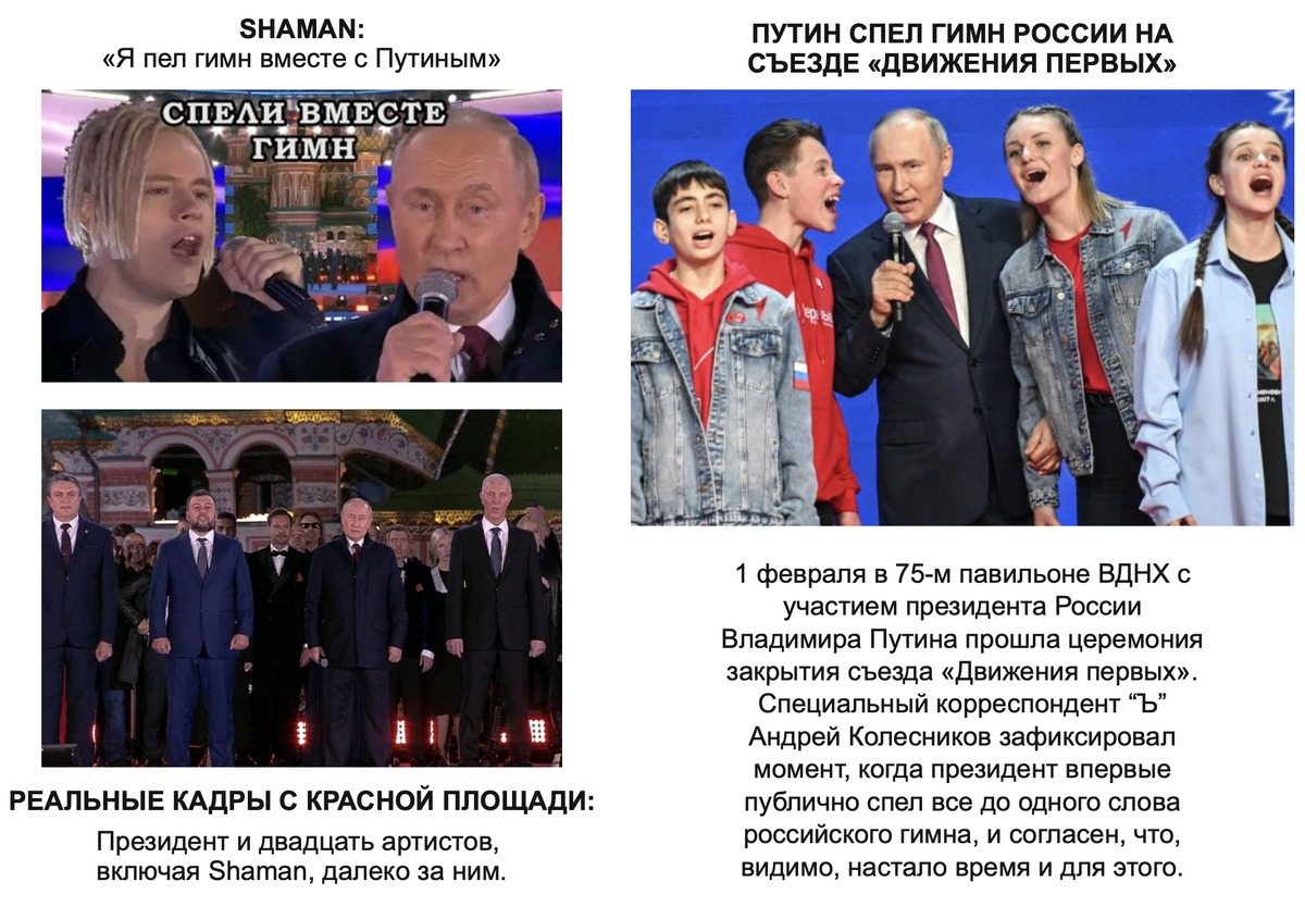 Правду слышать всегда неприятно. Конкретно здесь она крайне неприятная. Но сначала я хочу остановиться на “желаемой” картинке; на том, за кого яростно пытаются выдать Shaman’а. Конкретно здесь, на этой площадке, я только и вижу новости о том, какой он “самый-самый”. Вообще во всём. Патриот? Да, самый лучший. Артист? Да, самый популярный. Уклон вы поняли. И этим самым люди, продвигающие его, намеренно оставляют остальных на заднем плане. А как же те, кто ездят на концерты в новые регионы? Те, кто долгие годы под свист пуль выступали? Те, что по 20-30 лет заслуживали свою репутацию на деле, а не возникли из ниоткуда при огромной медиа-поддержке! И теперь я хочу подробнее остановиться на 3 неприятных фактах, подтверждающих ключевой тезис материала о сплошной пропаганде непонятных ценностей: “Я пел гимн вместе с Владимиром Владимировичем”. Как он добился такого уровня, что с самим Президентом в дуэте исполнял гимн? А никак! Ловкость рук монтажёров, и никакого мошенничества, как говорится.