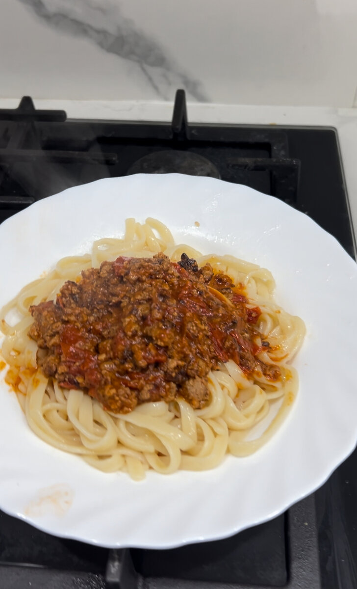 Быстрый ужин из фарша или как называют «Спагетти болоньезе». Вкусное, простое и очень сытное блюдо! ингредиенты : – фарш мясной 350 г (у меня смешанный свинина/говядина) – лук репчатый 150 г – масло растительное 1,5 ст.л – помидоры 400 г – спагетти 250 г – томат. паста 2 ст л – вода 200 г – соль/ перец по вкусу Приятного аппетита!