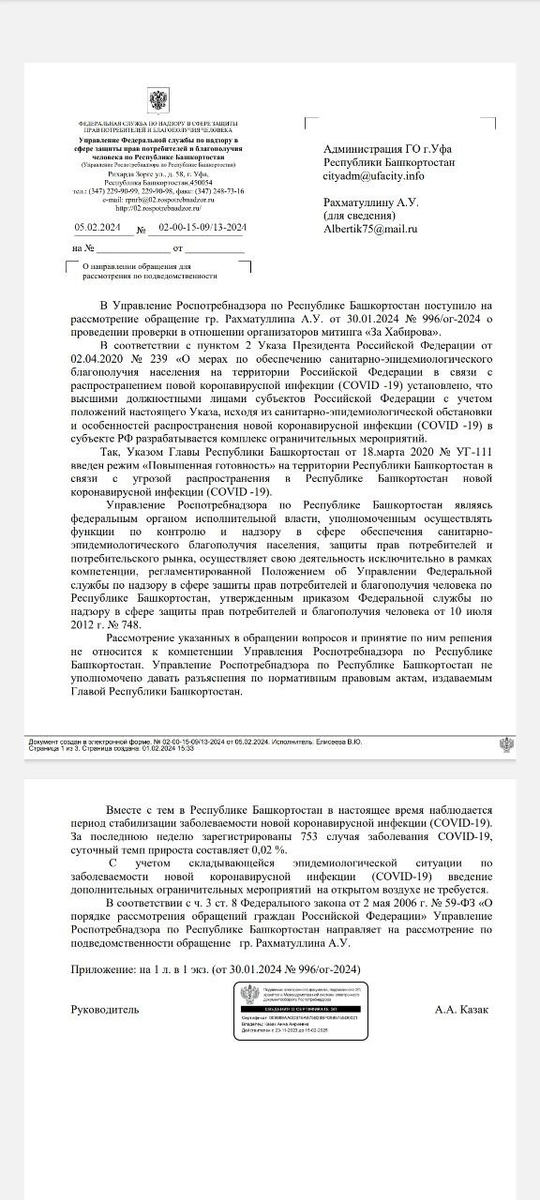 Для начала напомню, что после получения движением "СтопБашРТС" отказа из-за ковидных ограничений в проведении митинга против высоких платежей за отопление, я направил в Прокуратуру РБ и Роспотребнадзор по РБ жалобу на организаторов митинга в поддержку штанов Радия Хабирова с требованием привлечь их к ответственности за несоблюдение Указа Главы РБ о повышенной готовности в связи с пандемией короновируса.