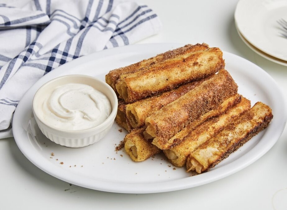 Сложность: легкий рецепт Время приготовления: 20 минут Ингредиенты (на 10 порций): Очищаем яблоки от кожуры и сердцевины и нарезаем небольшими кусочками. Далее берём небольшую кастрюлю или сковородку и кладем в нее небольшое количество сливочного масла. Перекладываем туда наши яблоки и добавляем щепотку корицы и лимонного сока сверху. Готовим на слабом или среднем огне около 5 минут. Или пока яблоки не станут мягкими. Тем временем срезаем коржи с ломтиков тостов, затем раскатываем каждый из них скалкой. В неглубокой миске смешиваем сахар и оставшуюся корицу. В другой неглубокой миске взбиваем 2 яйца и 50 мл молока. Намазываем сливочным маслом одну сторону ломтика тоста. Добавляем примерно 1 ст.л. яблочной смеси на нижний край, а затем плотно сворачиваем и придавливаем лицевой стороной вниз. Повторяем этот же процесс с оставшимися ломтиками тоста. После этого обваливаем каждый рулет в яично-молочной смеси. Разогреваем оставшееся сливочное масло в сковороде на средне-сильном о