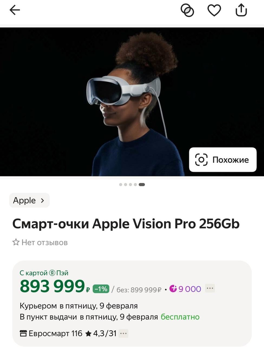 На Яндекс Маркет завезли Vision Pro почти за миллион рублей.