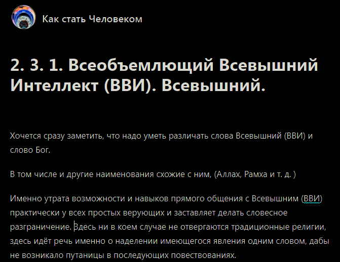 ВВИ (Всеобъемлющий Высший Интеллект) для вас лично, дабы сложился начальный некий образ, можно представить, как некий соборный интеллект всех людей на планете Земля + все возможные существующие информационные алгоритмы на полевой основе как некий главный Эгрегор, который имеет связь с алгоритмами от Космоса и охватывает всё то что существует и всё то, что мы можем осознать.