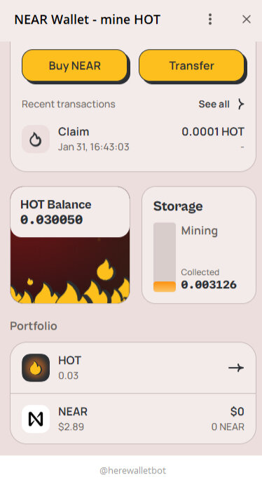 HOT — это центральная часть экосистемы NEAR внутри Telegram. Благодаря мета-транзакциям использование HOT позволяет совершать реальные транзакции в блокчейне, играть в игры и оплачивать переводы. Это первая FT, которая обладает функционалом нативных токенов блокчейна L1. Как вывести Hot? Пока никак. В будущем HOT будет работать не только с NEAR Ecosystem. После того, как во втором квартале 2024 года начнется что-то под названием Chain Abstraction, вы сможете использовать HOT для совершения транзакций в Ethereum и других сетях, похожих на Ethereum. Как начать майнить HOT Процесс майнинга начинается, как только вы создаете кошелек по ссылке HOT и получаете свой первый бесплатный HOT при нажатии кнопки «Claim». После того, как вы получили свой первый HOT, начинается процесс майнинга, но он остановится, когда заполнится панель хранилища. Хранение Сначала у вас очень маленький огонь и каждые 2 часа нужно следить за тем, чтобы он не погас. Для этого существует индикатор Storage. Как только