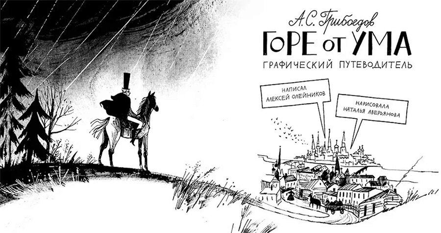 Просмотр спектакля по произведению мало чем мне помог. «Краткое содержание» из интернета – тоже, потому что оно не поможет ответить на коварные вопросы по любому отрывку текста, которые встречаются в проверочных тестах. На просторах интернета чего только не встретишь, но не всегда находятся компетентные ответы. Поэтому я начала искать такого помощника в этом сложном деле, которому я могла бы доверять как надёжному источнику. И такой помощник нашелся – это «Горе от ума. Графический путеводитель» Алексея Олейникова и Натальи Аверьяновой в уже знакомом мне формате. В сентябре подобный путеводитель уже помог мне с «Онегиным».