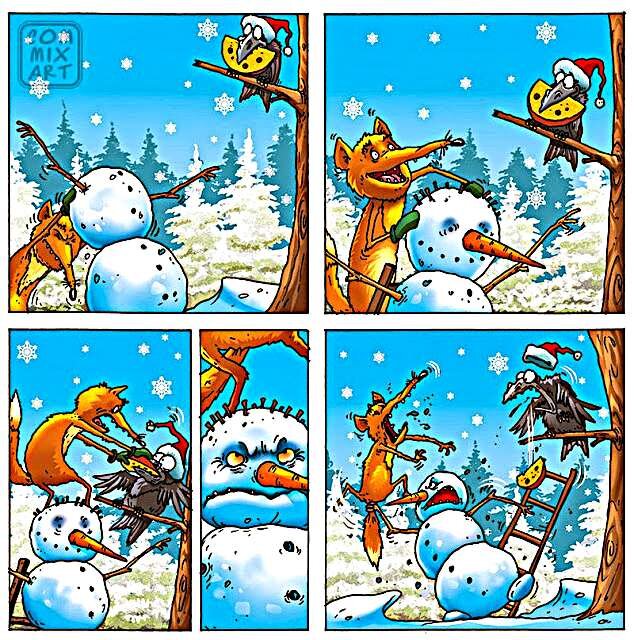 Для всех, кому нравятся басни-переделки про лисицу, ворону и сыр, приключения трусливого страуса и находчивость рыбака из "Золотой рыбки". Вас безусловно порадует ещё одна серия комиксов про будни снеговиков. Создали персонажа друзья-художники из Чернигова, которые нарисовали оригинальные и смешные современные версии по мотивам сказок, басен, кино, на "новый лад". Совместный комикс-проект Александра Бронзова и Игоря Жеведя называется Commicsariart. Творческий дуэт иллюстраторов обожает создавать карикатурные истории. Александр отвечает за идею и чёрно-белый набросок. Мастер - фотошопа - Игорь, накладывает цвет и подбирает подходящий фон. В итоге получаются яркие и узнаваемые позитивные работы. Рисуют они с любовью, продумывая даже самые мелкие детали и иллюстрируют книги. Новогоднее чудо Как вариант, возможно, так он появился на свет. Лисица слепила снеговика, чтобы отобрать у вороны сыр. Магия сказочного леса оживила её творение. И началась веселуха! Лыжник Снеговик уже влетает в подб