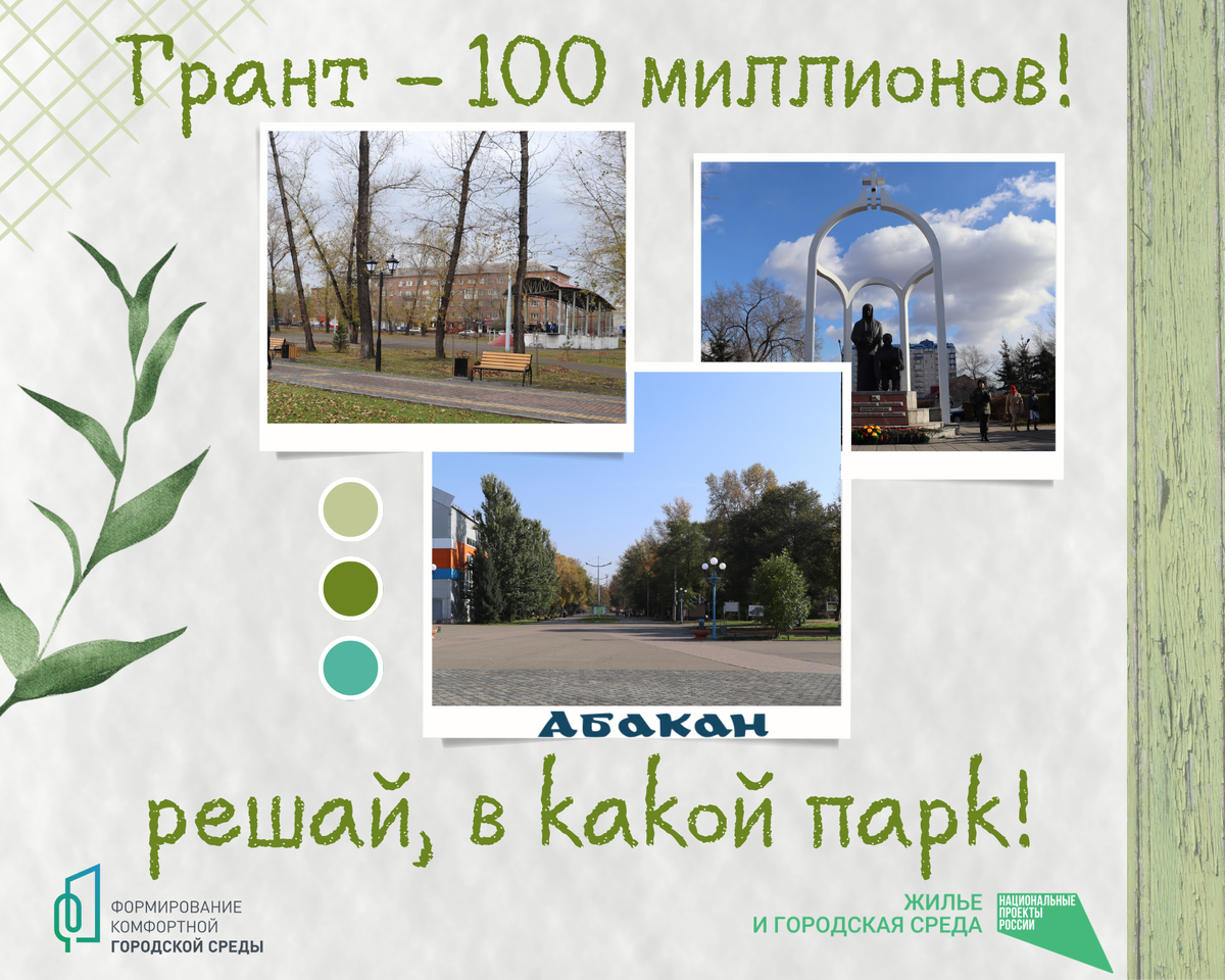 Абакан будет участвовать во Всероссийском конкурсе лучших проектов создания комфортной городской среды в 2024 году. Для участия в первом этапе нужны предложения от абаканцев: преображение какой территории нужно разработать и подать на конкурс для реализации проекта создания комфортной городской среды в 2025–2026 годах. Гранты серьезные: сумма на благоустройство победившей территории — порядка 100 миллионов рублей! Предложения подаются жителями Абакана с 14 по 26 февраля 2024 года. Подать предложения можно несколькими способами: голосованием в социальных сетях «Абакан официальный», предложением на электронную почту или письмом по почте. В социальных сетях мы выбираем из трех территорий: Парк культуры и отдыха, Черногорский парк и сквер Привокзальный сквер. Территория, которая наберет больше всего голосов, перейдет на второй этап. Для нее будет разработан специальный проект преображения, в котором обязательно будут учитываться рекомендации и мнения горожан. ВКонтакте: https://vk.com/offi