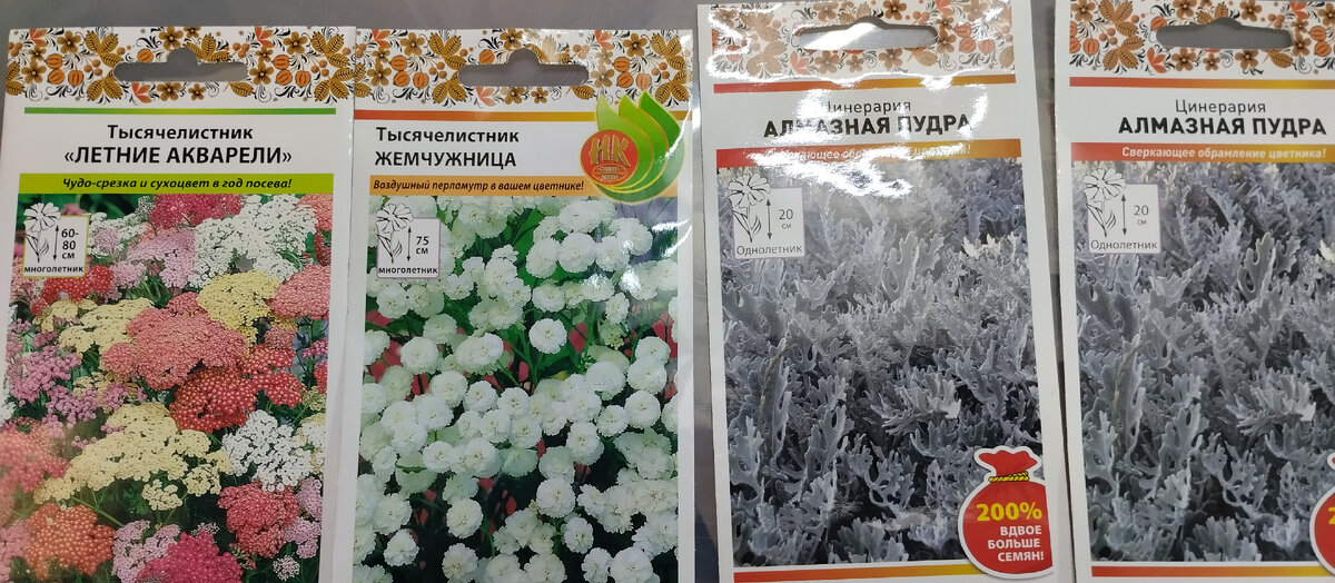 Это те, что купила в Русском огороде. Ехала за цинерарией. Ее я там нашла, правда не сама, а с помощью консультанта. Но купила. Ну и конечно еще за компанию взяла. Вот она, цинерария()). И тысячелистник. Его еще не пробовала, посмотрю как он у меня расти будет. Ромашки разного роста и вида. Ну это вот решила попробовать вырастить из семян ге@еры. Дельфиниум тоже только готовый саженец сажала. Он у меня погиб, два года был. Потом дождливое лето и все, сгнил. Вот попробую, может получится. И душистый горошек. В комментариях про кобею мне написали про него, что без проблем растет и вьется. Вот попробую. Это для вертикалей. А это горизонтали. Почвопокровники. Пока они у меня не сильно хорошо разрастаются. Но посмотрим, надо же пробовать. А это экзотика. Виола черная, капуста с неожиданным решением, ну и новинка. Даже не знаю, что-то из лилейных. Посмотрим. Не обошлось и без овощных семян. петрушка корневая. Два базилика. И баклажаны. Баклажаны я здесь не выращивала еще, как и перец. В В