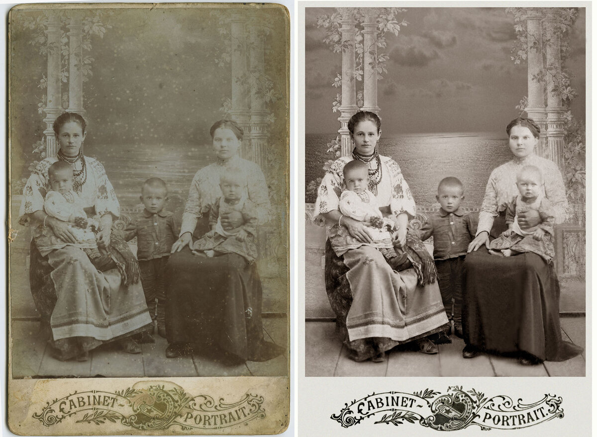 Был период в моей жизни, когда я работала в фотостудии, занималась компьютерным дизайном — делала календари, буклеты, визитки, логотипы и т.п., в том числе очень часто приходилось выполнять обработку фотографий — восстановление, реставрацию, расцвечивание старых снимков. Сейчас, с развитием различных нейросетей это, наверное, делается намного проще и быстрее, а 20 лет назад приходилось немало повозиться в Фотошопе, чтобы из повреждённого фото сделать что-нибудь приличное. Мы всегда относились с пониманием, люди приносили самое дорогое — фотографии своих близких, ведь это так важно — сберечь для будущих поколений память о корнях, о своих предках. Показываю только те работы, которые я делала сама, вообще, их у меня сохранилось не очень много. Иногда очень интересные фотографии приносили заказчики, у каждого снимка своя история... (Это уже восстановленный вариант). Вот ещё несколько интересных исторических снимков... некоторые фотографии сделаны в начале прошлого века, рассматривая их