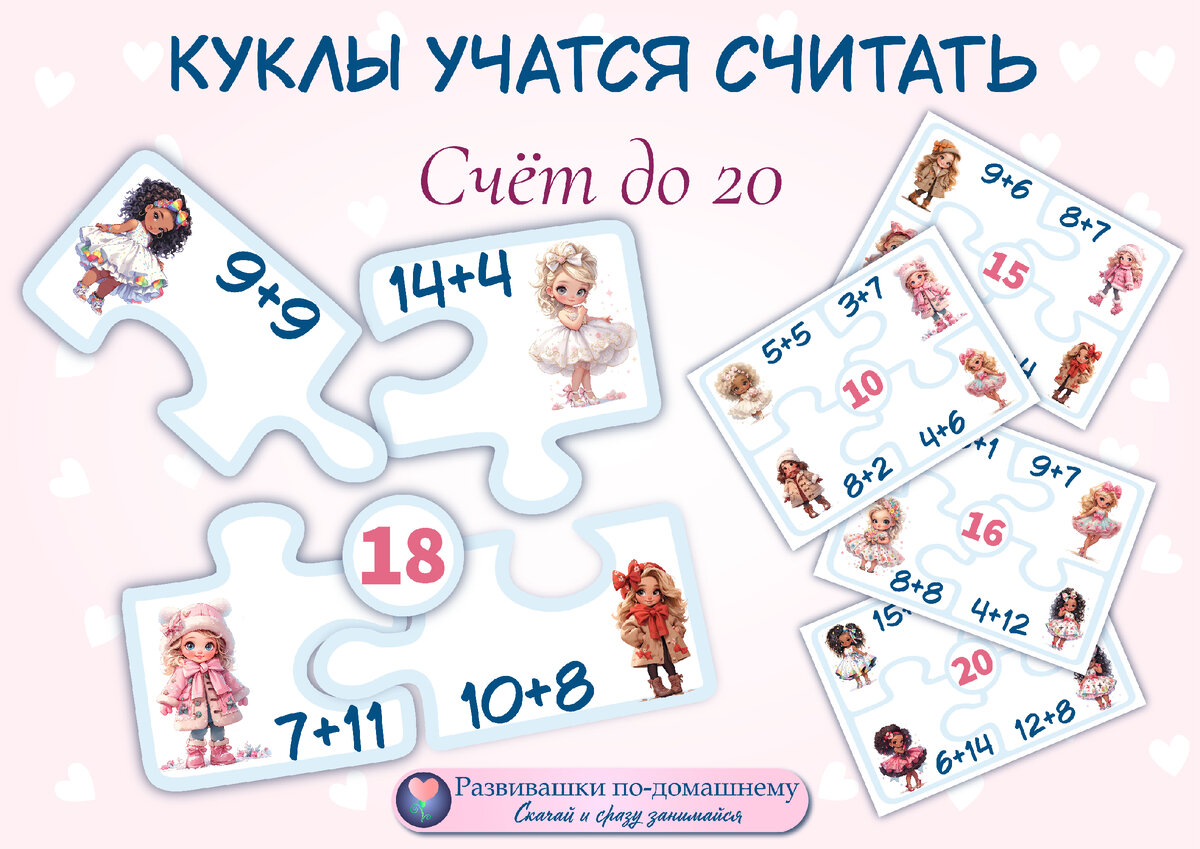 Развивашка с симпатичными куколками может легко и быстро улучшить навык счёта. Где скачать шаблоны для распечатки смотрите в конце статьи В шаблон входят 11 листов с примерами на числа от 10 до 20. Эти листы нужно: И только освоив составление пазлов на несколько чисел, перемешивайте все числа от 10 до 20. Таким способом ребёнок не утомится считать, а будет играть с удовольствием. И примеры будет щёлкать, как орешки! Успехов вам и вашим деткам в навыках счёта! Играйте с удовольствием! 🔥Здесь вы можете познакомиться подробнее с этой игрой ( в рубрике "Учимся считать"): 👉 https://vk.com/@-204438910-katalog-igr-i-posobii-po-temam 🧡Пишите в комментариях, какие бы развивающие пособия вы хотели, чтобы я создала. Что-нибудь придумаем ❗
