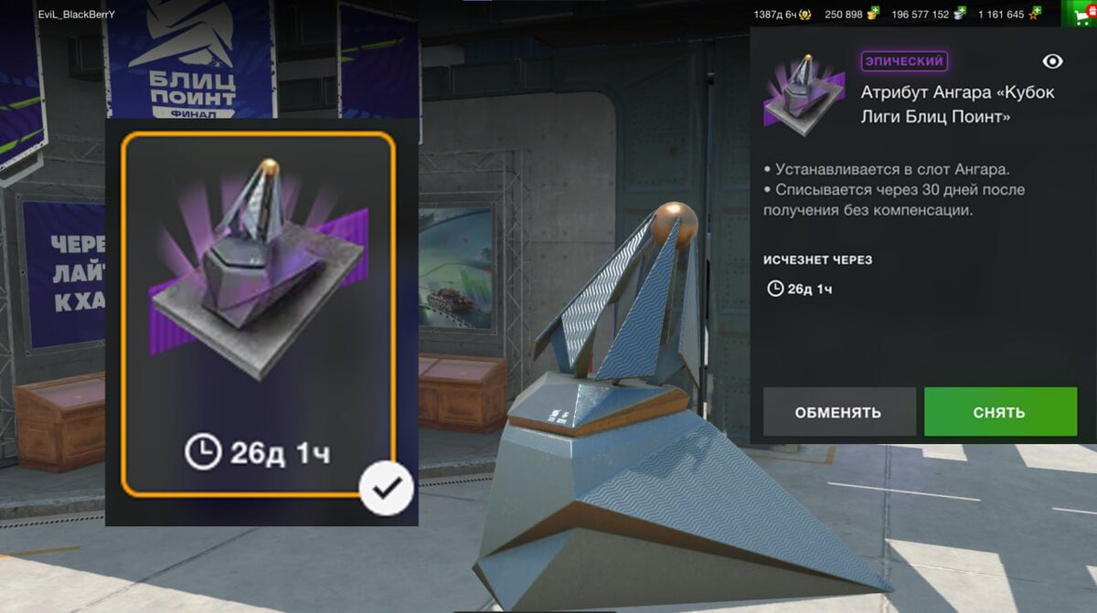 🤬Почему обвес "Кубок Лиги Блиц Поинт" дали на 30 дней? — Эта награда предназначена игрокам топ1 команды в финале турнира, этим игрокам начисление данного атрибута будет выдано навсегда. — Игрокам дали возможность установить временно данный атрибут, я склоняюсь к варианту, что разработчики посчитали хорошей возможностью дать этот атрибут посмотреть у себя в ангаре каждому желающему, но временно. 🤔Почему бомбят? — Квест на 105 тысяч в настоящих реалиях что-то сложное? Да вроде нет..Особенно в рамках недели этого квеста. — Условия выдачи этого атрибута были прописаны ещё в квесте, что он временный и выдается только на 30 дней — Перед окончанием таймера, вы можете обменять этот атрибут на 1000 осколков. — Хотите атрибут навсегда? Тренируйтесь год, играйте сезоны 8 месяцев, и лутайте данный атрибут на свои аккаунты.