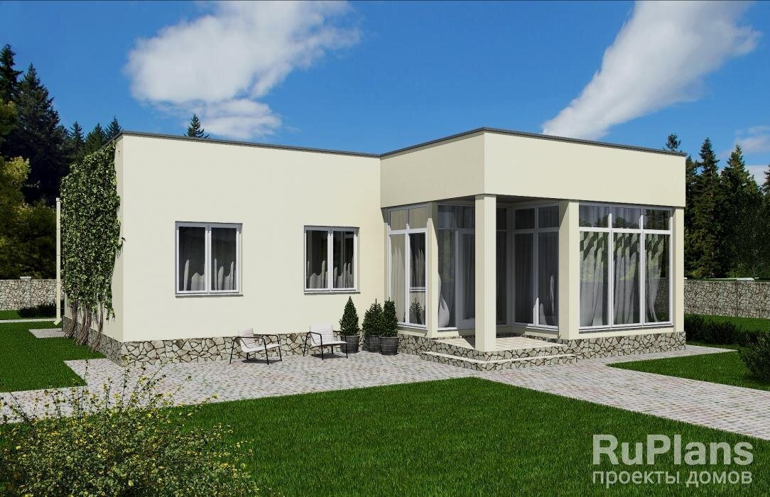 Проект частного жилого дома с готовым дизайном Одноэтажный жилой дом с размерами здания 13,57 х 12,47 м. Наружная отделка здания – штукатурка. Фундамент – монолитная ж/б плита под всей площадью дома. Наружные стены – газобетонные блоки. Внутренние стены – газобетонные блоки.. Перегородки – газобетонные блоки. Пол этажа – по монолитной плите. Крыша плоская. Перекрытие плоской кровли - монолитная ж/б плита. Окна — металлопластиковые.