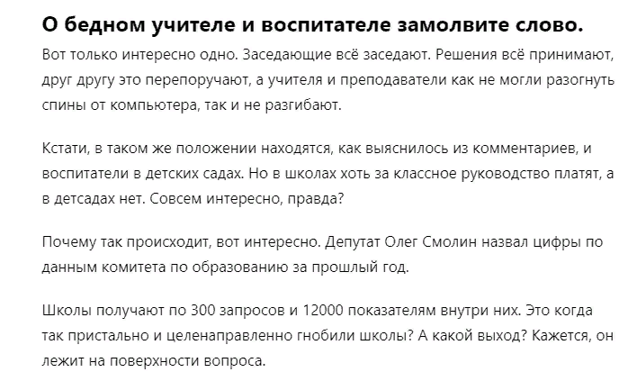 Вопрос об избыточной документационной нагрузке для учителей остаётся на повестке дня. И он открыт. Не могут с этим чиновники ничего сделать. Интересно, почему? И ведь нагрузка растёт день ото дня. Учителей вроде разгружают, а вроде продолжают нагружать. Про это пишут и говорят многие. И те, кто понимает, почему и знают, что надо сделать. И те, кто не понимают, почему. Но продолжают рассуждать-решать-мониторить итд. Это цитата из вот этого поста. Вот ссылка. Загляните. там много инересного- Наш уважаемый министр думает, что всё хорошо у него в ведомстве, и в том постоянно убеждает президента. Интересно, а президент ему верит или нет, как думаете? Но в последнее время он так пристально на него смотрит, заметили? Как-будто хочет вывести на чистую воду или услышать о проблемах. Но проблем нет. У СС Кравцова. А у Музаева они есть, но он решает их точечно. А точечно, это не проблема. Это мы решим. Легко. А год уже почти прошёл. Смотрите по дате встречи с Михаилом Мишустиным. Решили? Вот