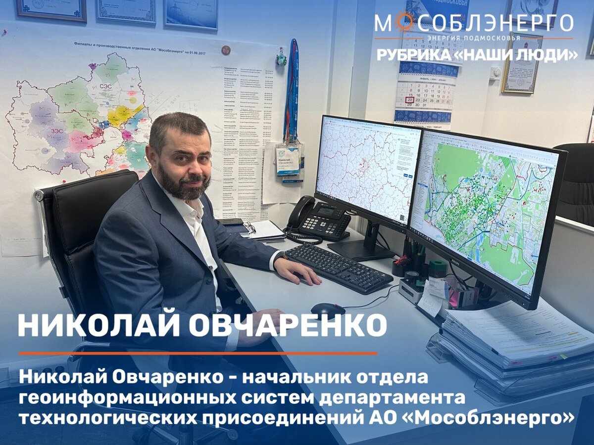 Николай Овчаренко – начальник отдела геоинформационных систем департамента технологических присоединений АО «Мособлэнерго». Его стаж в сфере энергетики составляет 26 лет. Николай Иванович начал трудовую деятельность в АО «Мособлэнерго» в 2006 г. На протяжении многих лет он возглавляет проект базы данных о расположении объектов электросетевого хозяйства компании - цифровую карту ЛЭП и подстанций, которая помогает идентифицировать их на местности. На ней также отражаются сведения о заявителях, желающих подключиться к сетям компании. Ежедневно картой пользуются в своей непосредственной работе более 1000 специалистов из департаментов технологического присоединения и капитального строительства энергообъектов, департамента корпоративной собственности и правового департамента, производственно-технических служб в аппарате управления и филиалах, и оперативно-диспетчерская служба. Систему ГИС Николай Иванович сравнивает с космическим снимком, который показывает земную поверхность со спутника. Та