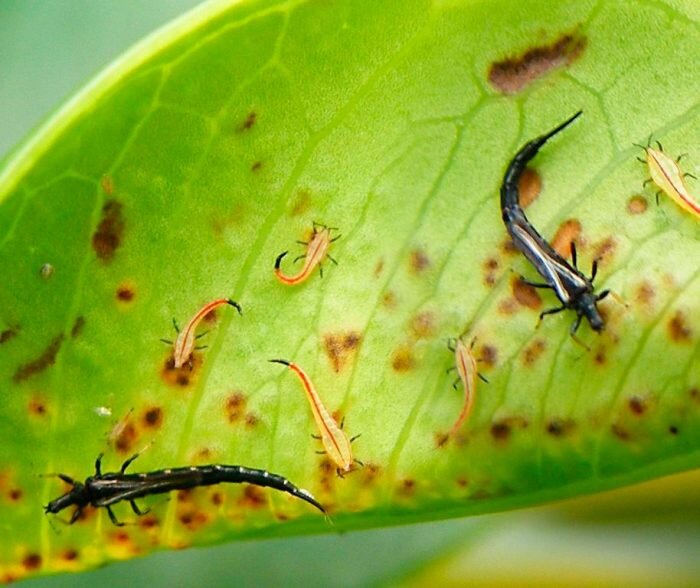 Молодые - белые, светло-серые, желтоватые 0,5-1 мм, взрослые до 2 мм коричневые/черные Трипсы вредят растению втечение всего года. Появляются в сухом и теплом микроклимате Очень быстро размножаются. Каждая самка откладывает по 100 яиц, через 2-10 дней из них появляются личинки и через 12-35 дней они уже превращаются во взрослых особей, которые снова откладывают яйца Признаки появления Первым признаком могут быть жёлтые пятна на листьях. Они появляются в местах, где трипсы высасывают сок растения Трипсы визуально очень портят лист - выедают его бороздами. Эти борозды со временем превращаются в царапины. Часто на листьях присутствует продукт их жизнедеятельности - блестящие черные капли/прозрачная жидкость. До появления борозд листья покрываются очень странным пятнами При сильном заражении листья сохнут и отпадают. Стебли вырастают кривыми. Растение теряет декоративный вид Некоторые взрослые особи имеют крылья и могут долететь до соседнего горшка Трипса крайне трудно увидеть на началь