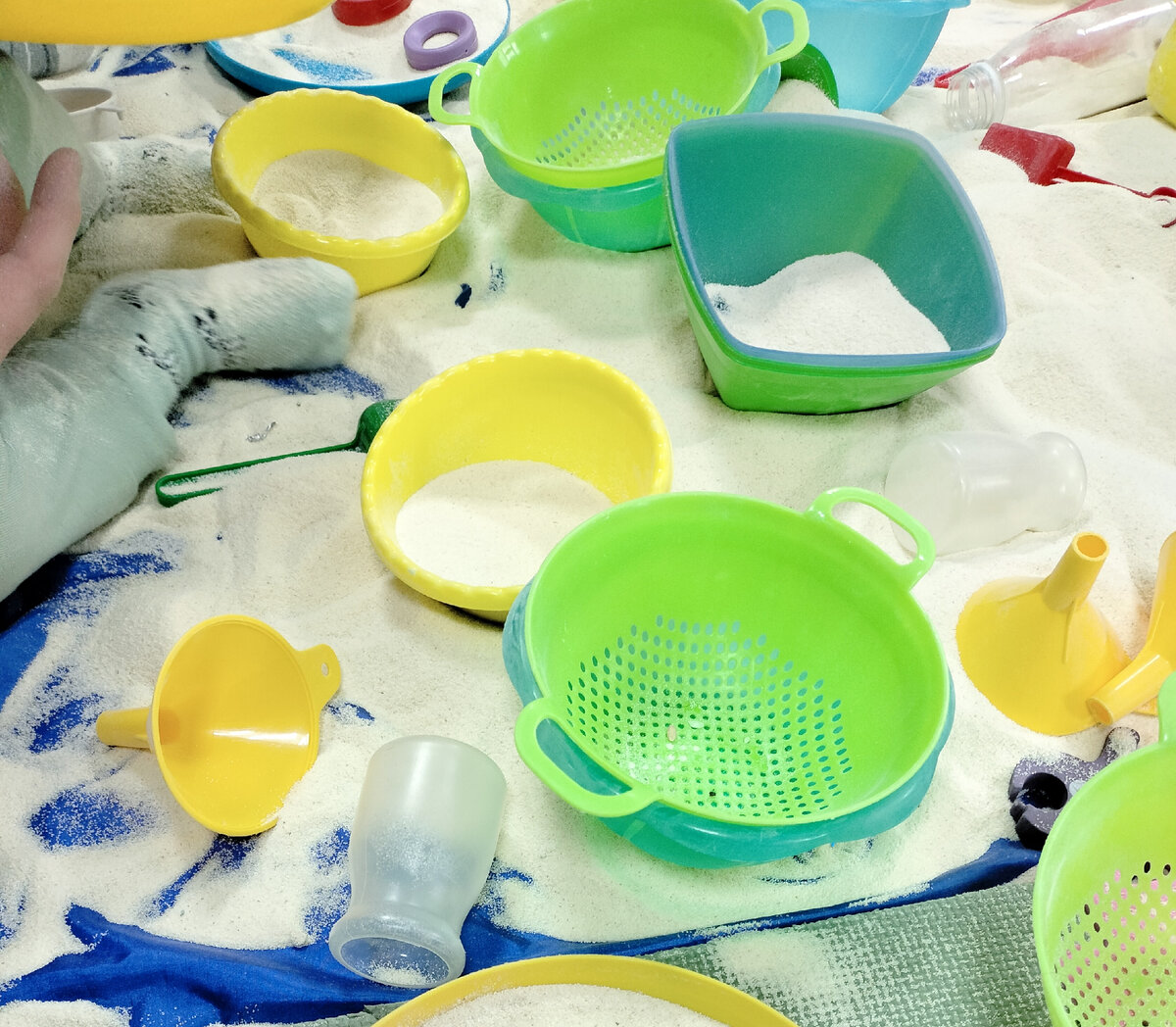 Крупяная история - музыкально-сенсорное погружение. Причем реальное погружение. Ребенок полностью в игре. Родители сидят и наблюдают, как их малыш играет, перебирает, пересыпает, что-то говорит. И при этом он такой спокойный, умиротворённый и главное довольный. Итак. Крупяная история - это занятие для малышей от года до трёх лет. Очень, много музыки и КРУПЫ. Крупы разной,в зависимости от тематики. Например,на "Дне рождения пингвинов" у меня манка. Всё происходит в игровой форме, как модно говорить, интерактивно. Сначала мы плывём на льдине и рыбачим, потом встречаем пингвинов и гуляем с ними по дорожке в метель, а затем метель приносит нам много снега (манки). Её осторожно совочками высыпаем в импровизированную песочницу, а потом высылаем всё,что осталось. Так у нас появляется горка "снега". Дети по-разному реагируют. Кто-то поначалу с опаской относится к манной крупе и пересыпает совочком,а ручки отряхивает. Кто-то сразу без опаски трогает ручками крупу. Но потом происходит полное по