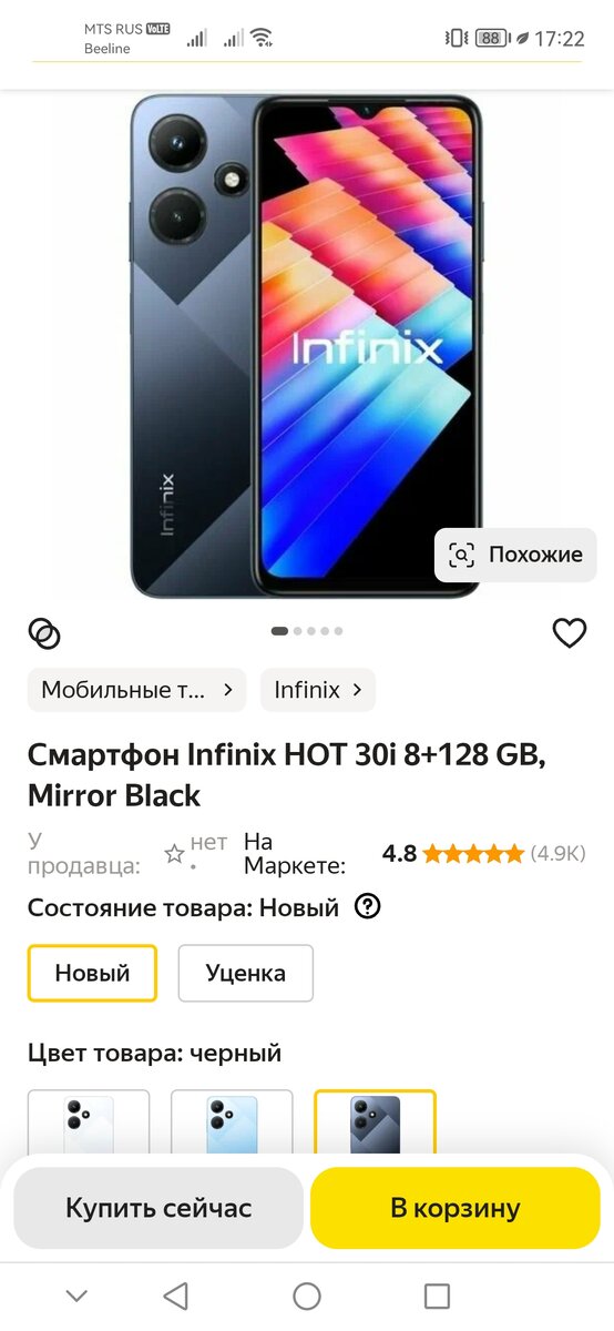 Нашли топопый телефон до 10000 Выбор хорошего, мощного и при том бюджетного телефона это не простая задача. Но с яндекс маркетом все решается. Смартфон Infinix Hot 30i не имеет конкуренции в своём классе 8гб оперативной памяти (можно расширить ещё на 8гб виртуальной памяти) 128гб внутренней памяти, которую можно увеличить картой памяти 2 симкарты Модуль NFS Экран 90Гц Аккумулятор на 5000мАч А так же набор неплохих камер. И всё это можно сейчас приобрести меньше чем за 10000 рублей Телефон подойдёт как детям так и взрослым, как для игр так и для повседневного использования. Оформить заказ можно по ссылке, так же выбрать объем памяти и цвет: