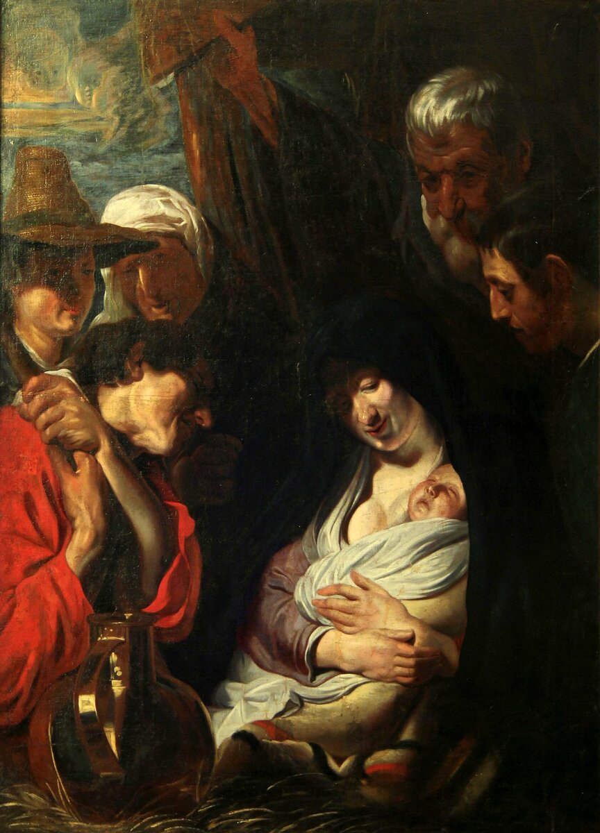 Мадонна с младенцем Иисусом в окружении фигур Святого Иосифа, сына Иосифа, пастуха, Саломеи и повивальной бабки, озаряемых лунным светом, пробивающимся сквозь облака с витающими в них головками Ангелов Божьих. Картина является, возможно, предварительным эскизом-моделло полотна работы Йорданса (I. Iordans. fecit 1618), ныне хранящегося в Национальном музее изящных искусств Стокгольма и написанного в ярком, контрастном освещении полуденного солнца. Наша картина (со сценой в лучах таинственного лунного света) ближе к описанию священного события в евангелии от Луки и преобладавшей в живописи эпохи барокко традиции изображения этого религиозного сюжета в ночном освещении, как это мы видим в живописных работах Пьетро Паоло Рубенса, Гвидо Рени или же Рембрандта.