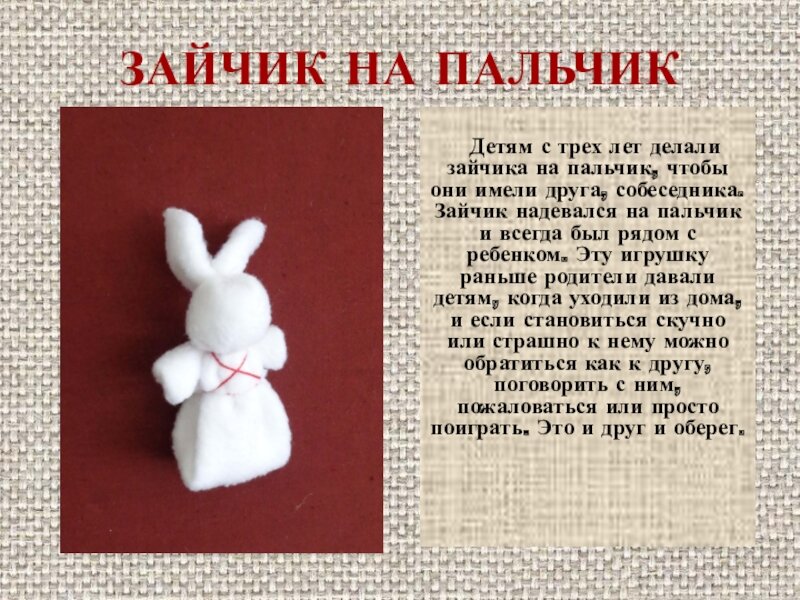 Народные куклы являются частью традиционной детской культуры. Они несут в себе определенные образы, ориентированные на традиционные представления о семье, семейном укладе, о женских и мужских ролях, о материнстве. В куклы дети играли раньше, играют и сегодня, и будут играть всегда. Кукла «Зайчик на пальчик» - это старая тряпичная игровая кукла-зайчик и оберег для детей. Зайчика на пальчик делали детям с трех лет, чтобы они имели друга, собеседника. Зайчик одевается на пальчик и всегда рядом с тобой. Зайчик надевается детьми на пальчик и крепко держится в ладошке. Эту игрушку раньше родители давали детям, когда уходили из дома, и, если становиться скучно или страшно к нему можно обратиться как к другу, поговорить с ним, пожаловаться или просто поиграть. Это и друг, и оберег. Вот такой этот зайчик, совсем непростой. Эта игрушка решает следующие Задачи: - привлекает внимание детей к русской культуре - заинтересовывает и успокаивает ребёнка Предлагаю вашему вниманию технологию изготовлен