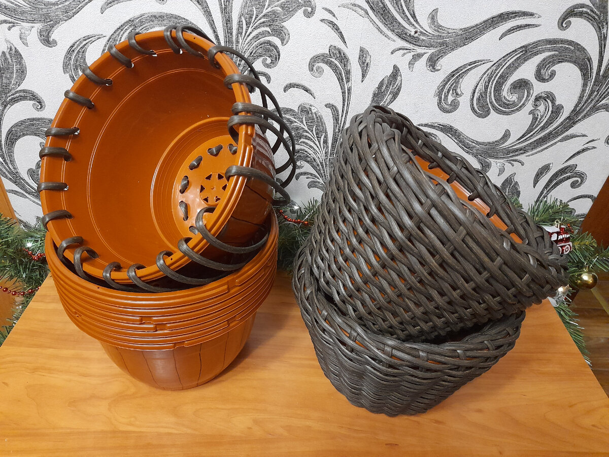 На новогодних праздниках я начала оплетать полиротангом 10 пятилитровых пластиковых кашпо. Двух килограммов ротанга мне хватило только на 7. Пришлось докупать еще. Как на зло ротанг, которым я плела, закончился и мне пришлось выбрать другой. Заказала 2 килограмма более светлого, но с такой же фактурой. От первой бобины остался небольшой кусок, его тоже использовала, комбинируя с более светлым. Получилось очень интересно. Готовые кашпо подвесила на черные металлические цепи. Их я покупала отдельно. Когда покупала светлый ротанг прикинула, что большая часть останется. Ее должно было хватить на два строительных ведра по 12 литров. Так и получилось. Теперь у меня два новых больших кашпо для горшечного сада. Все. На этот год мои планы по кашпо полностью выполнены. Все уже на даче и ждет весну.